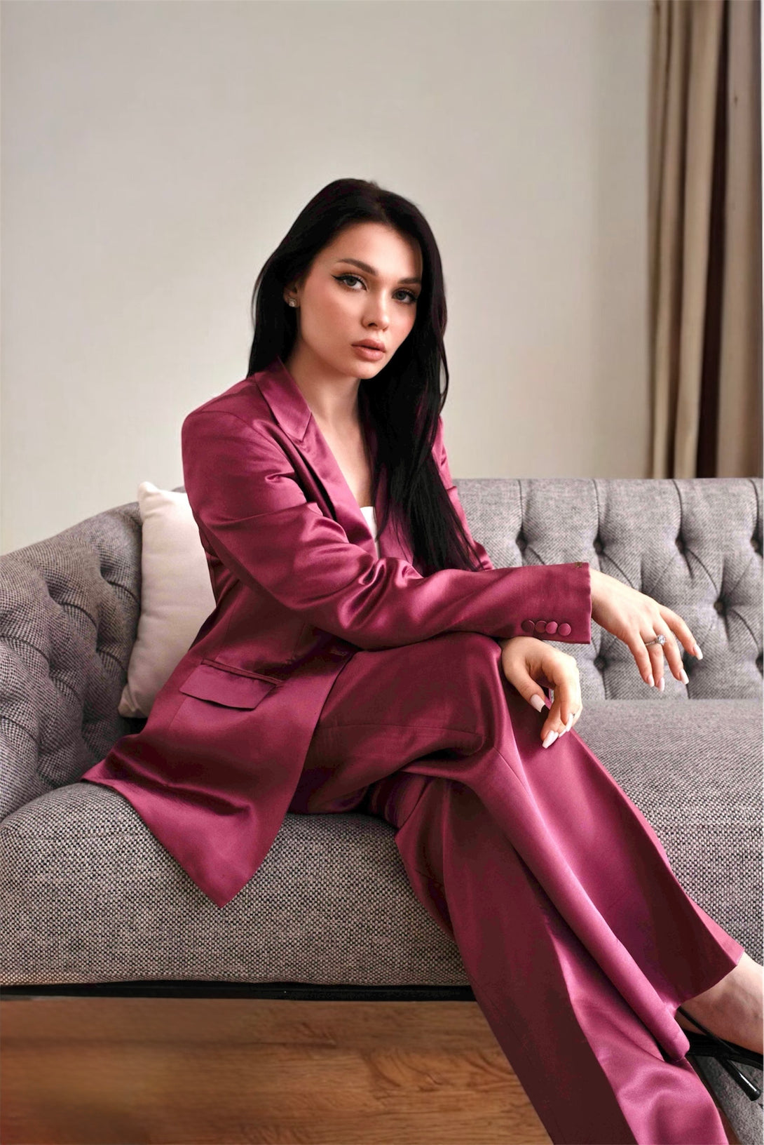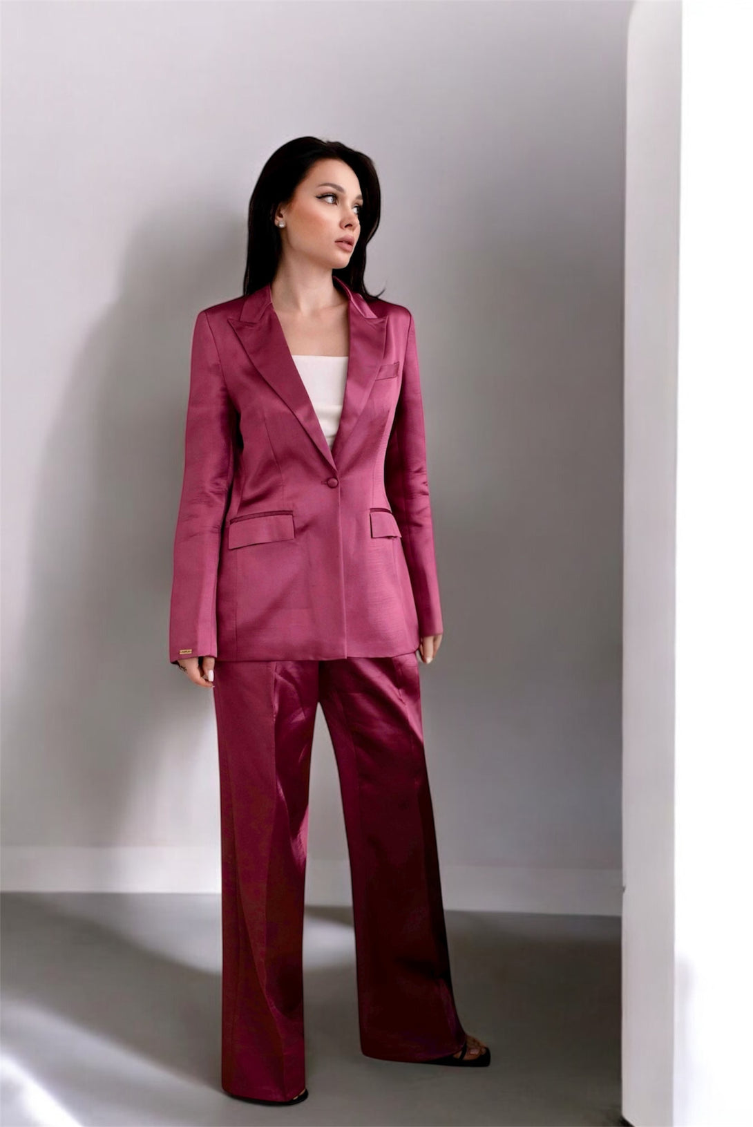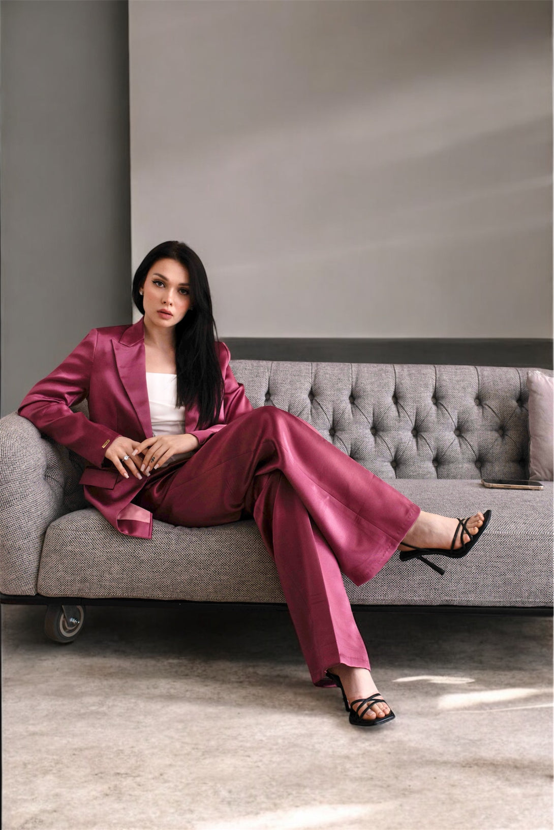 A luxurious magenta/berry suit made in silk fabric for a satin finish.