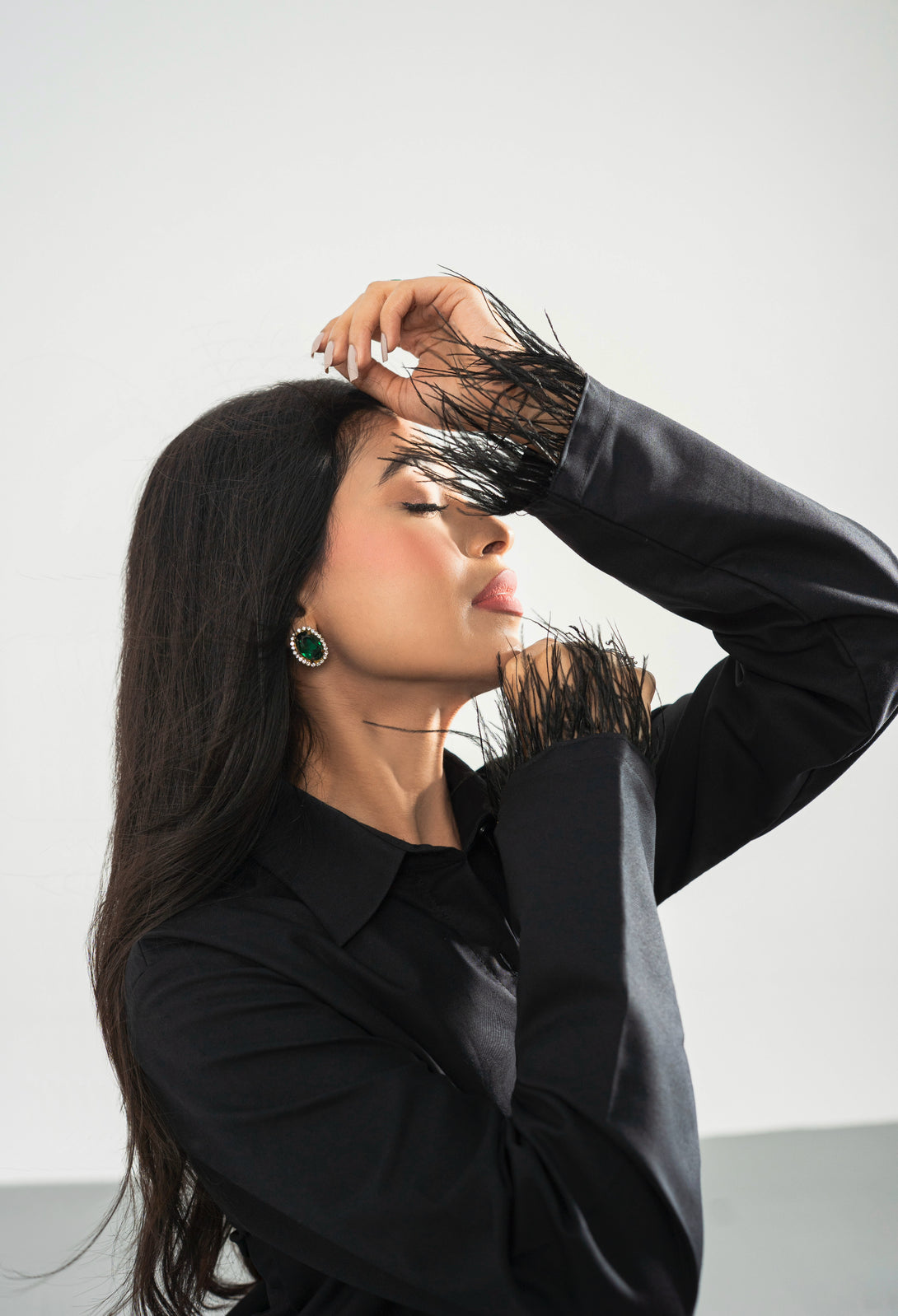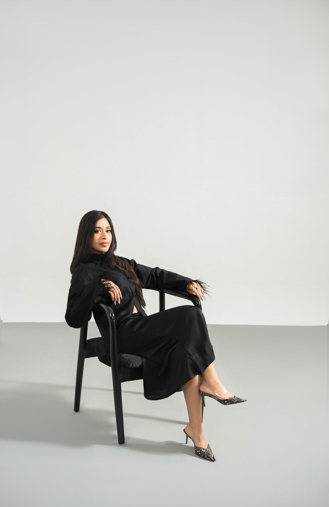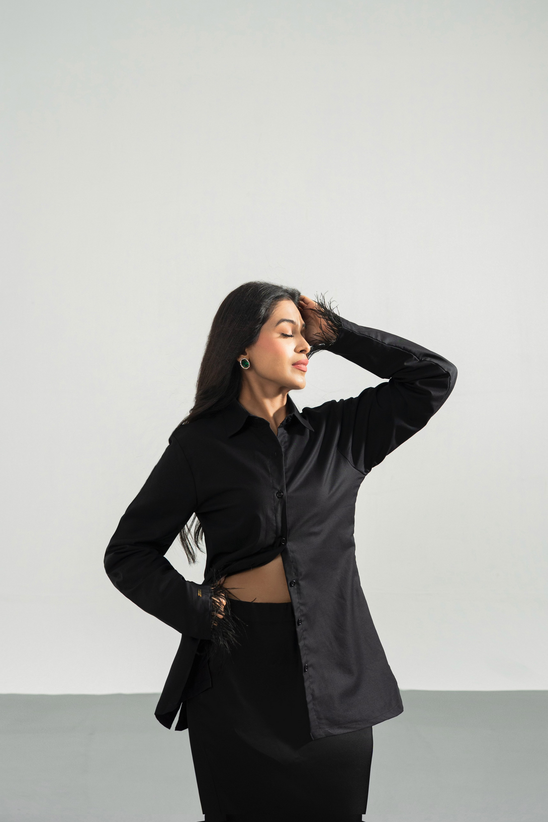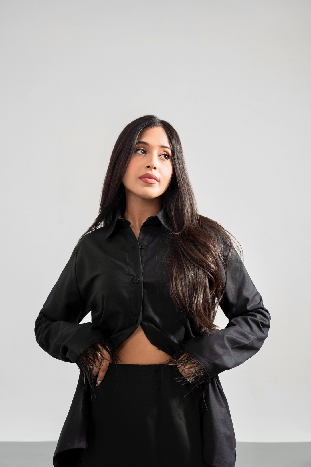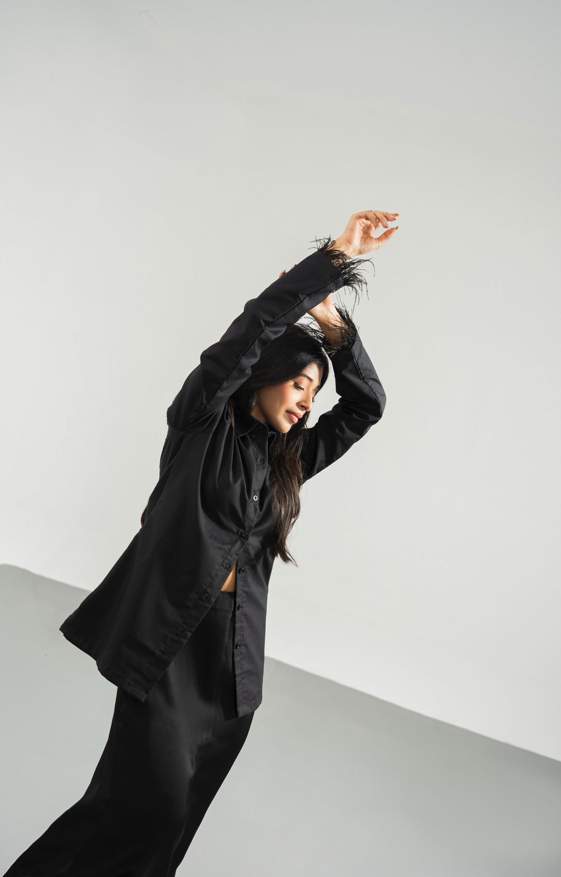 Black - Button Down Feather Trim Shirt