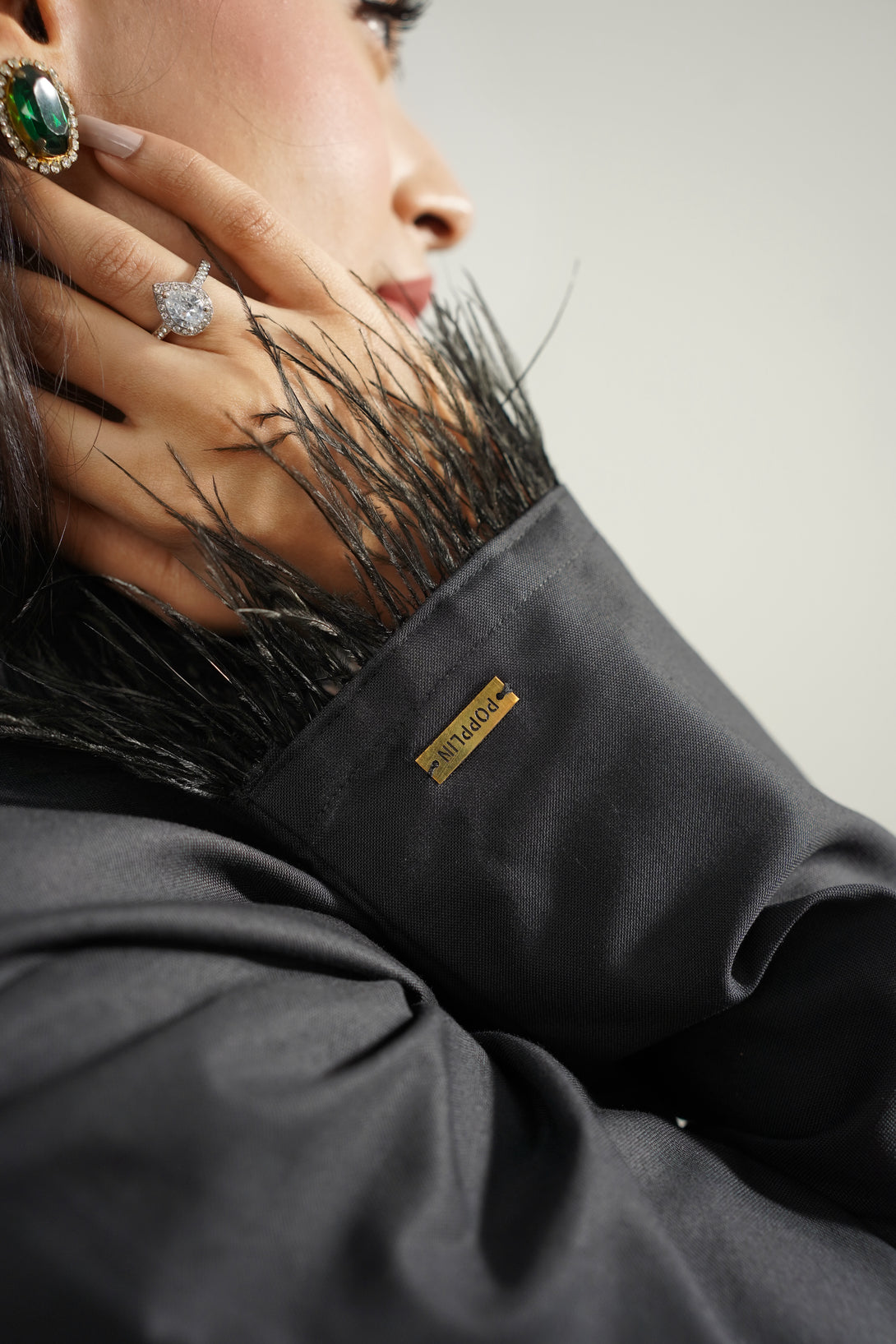 - Feather trim detailing on the cuffs