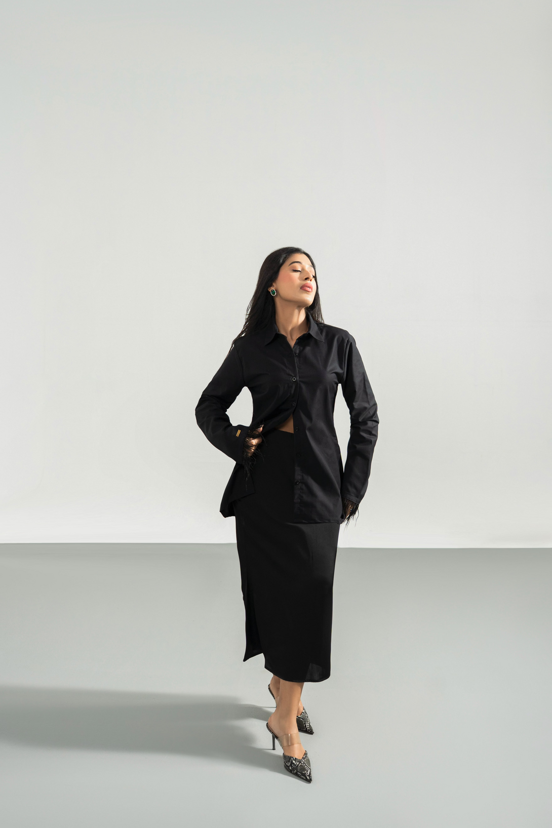 - High waisted - solid black, flowy skirt, long length