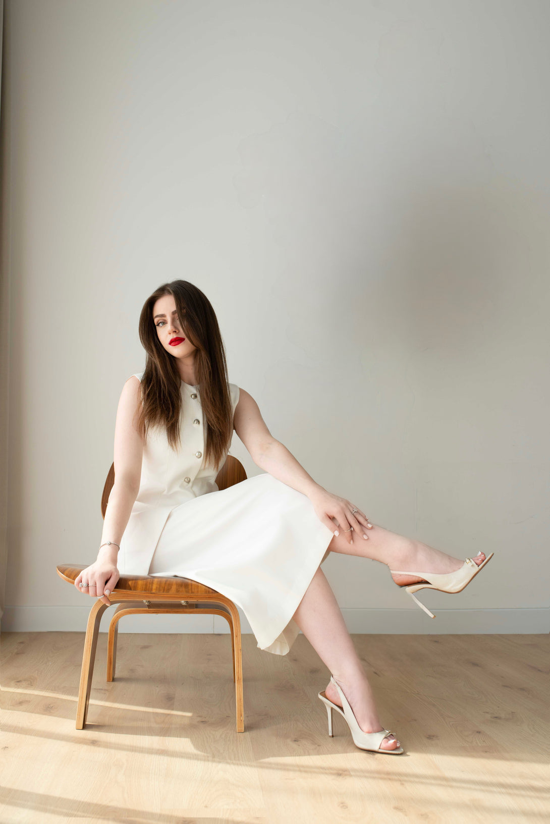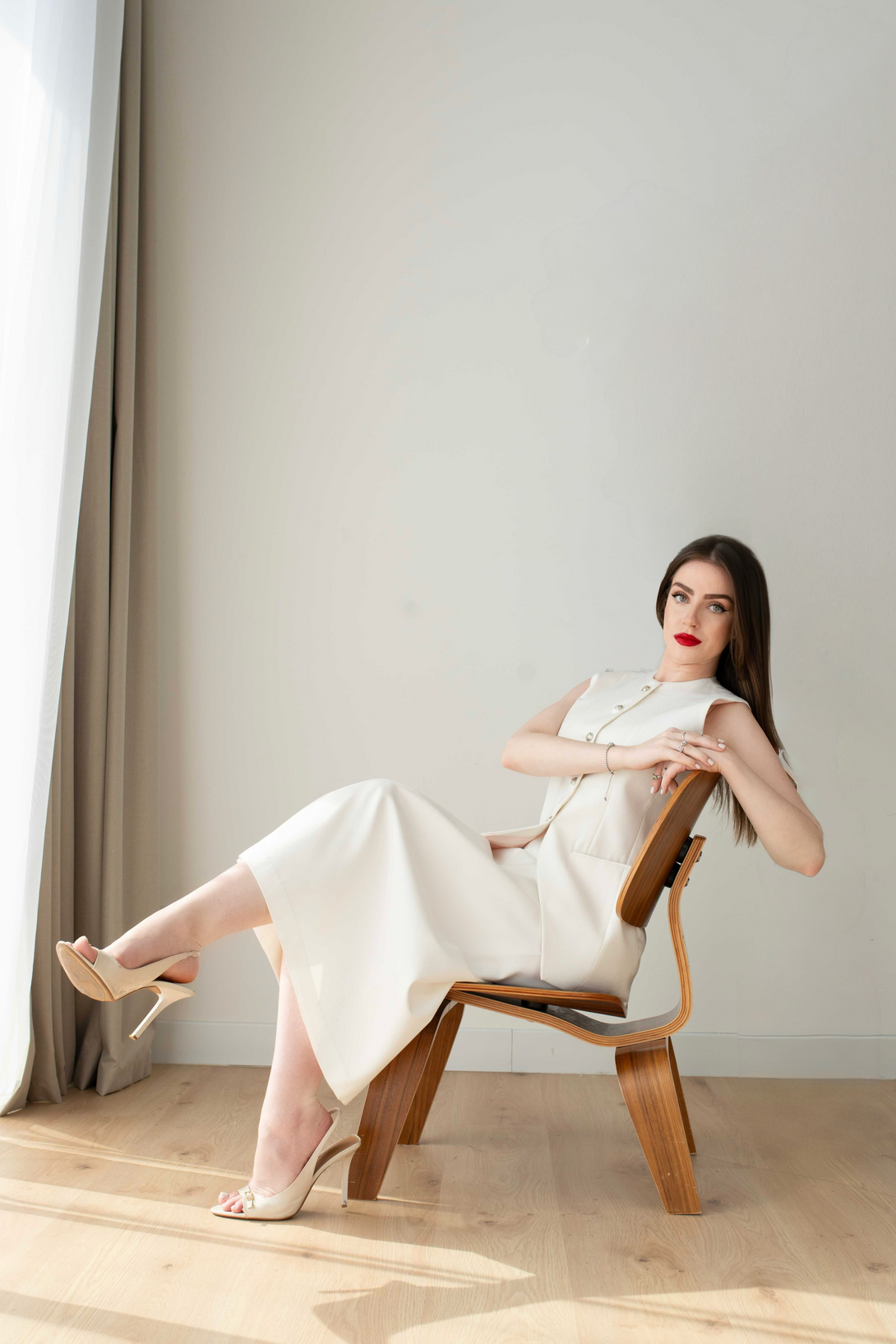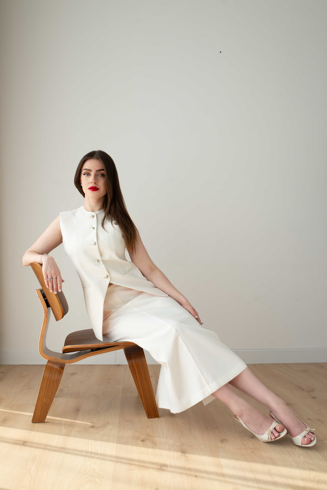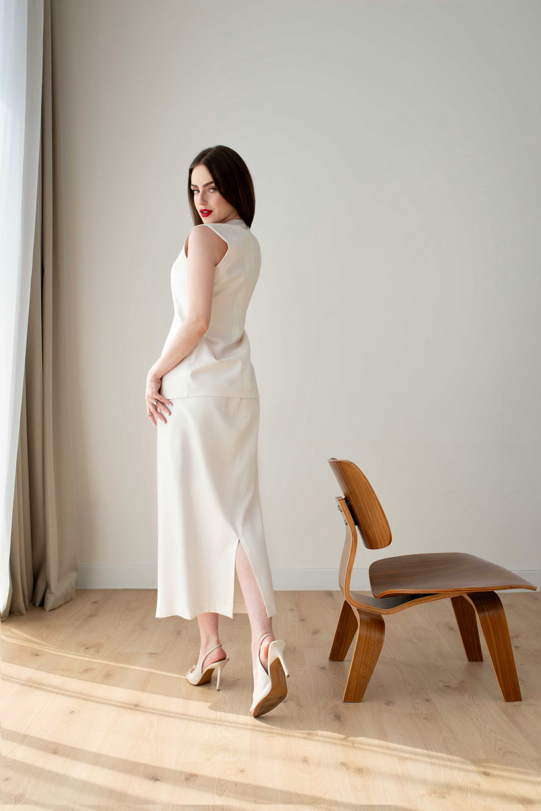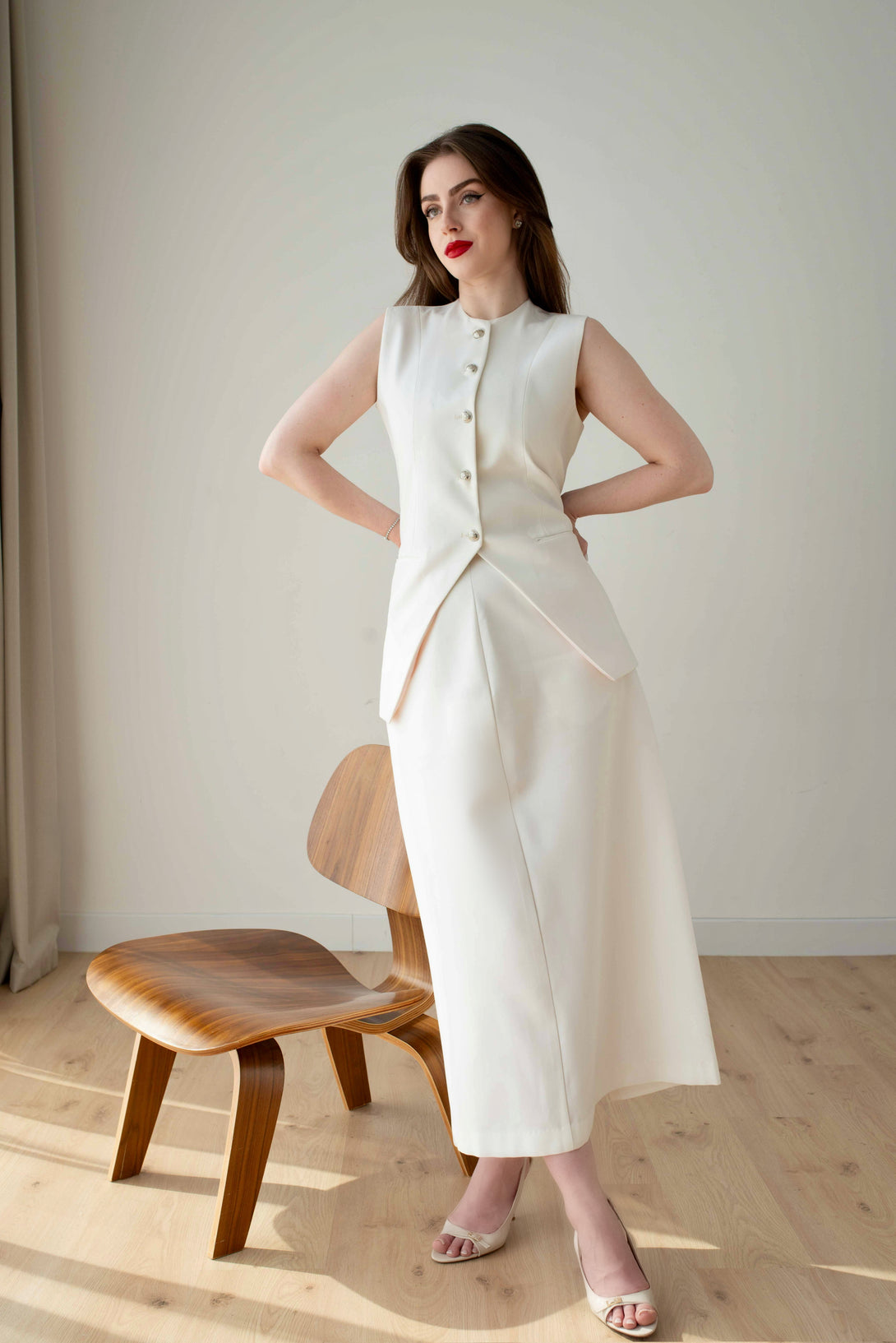 An elegant sleeveless vest and skirt suit in a sophisticated off-white cream hue.