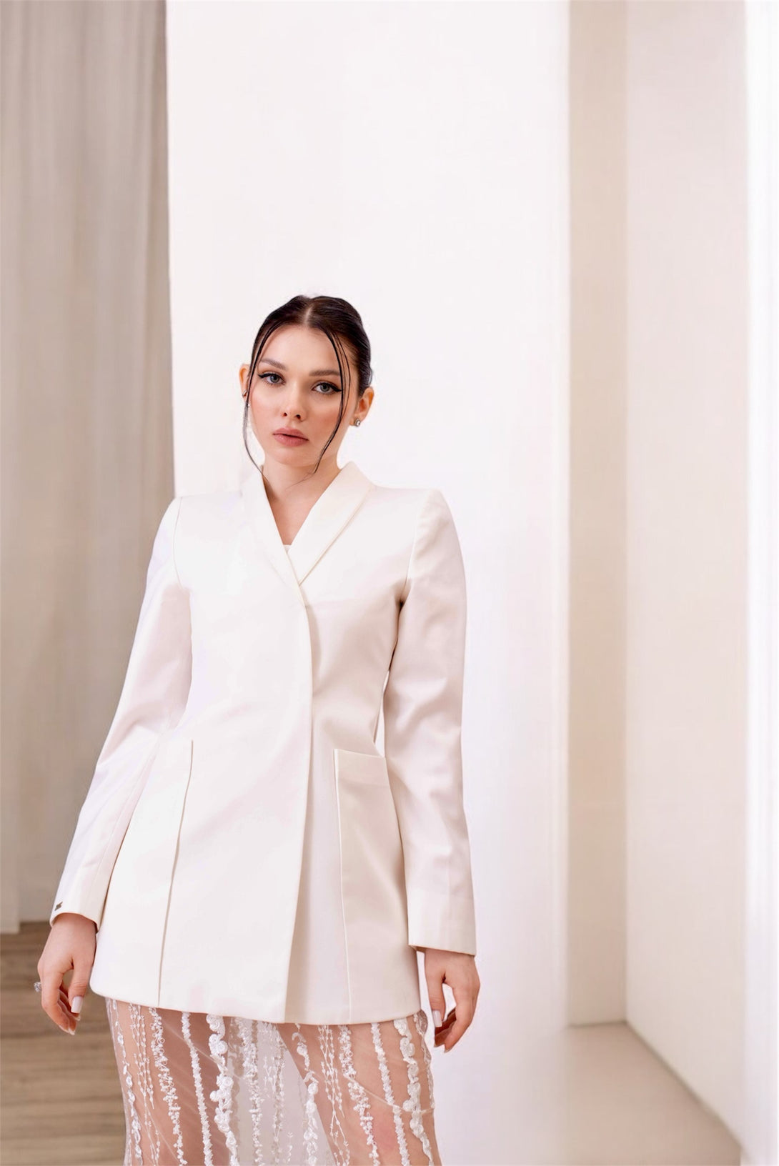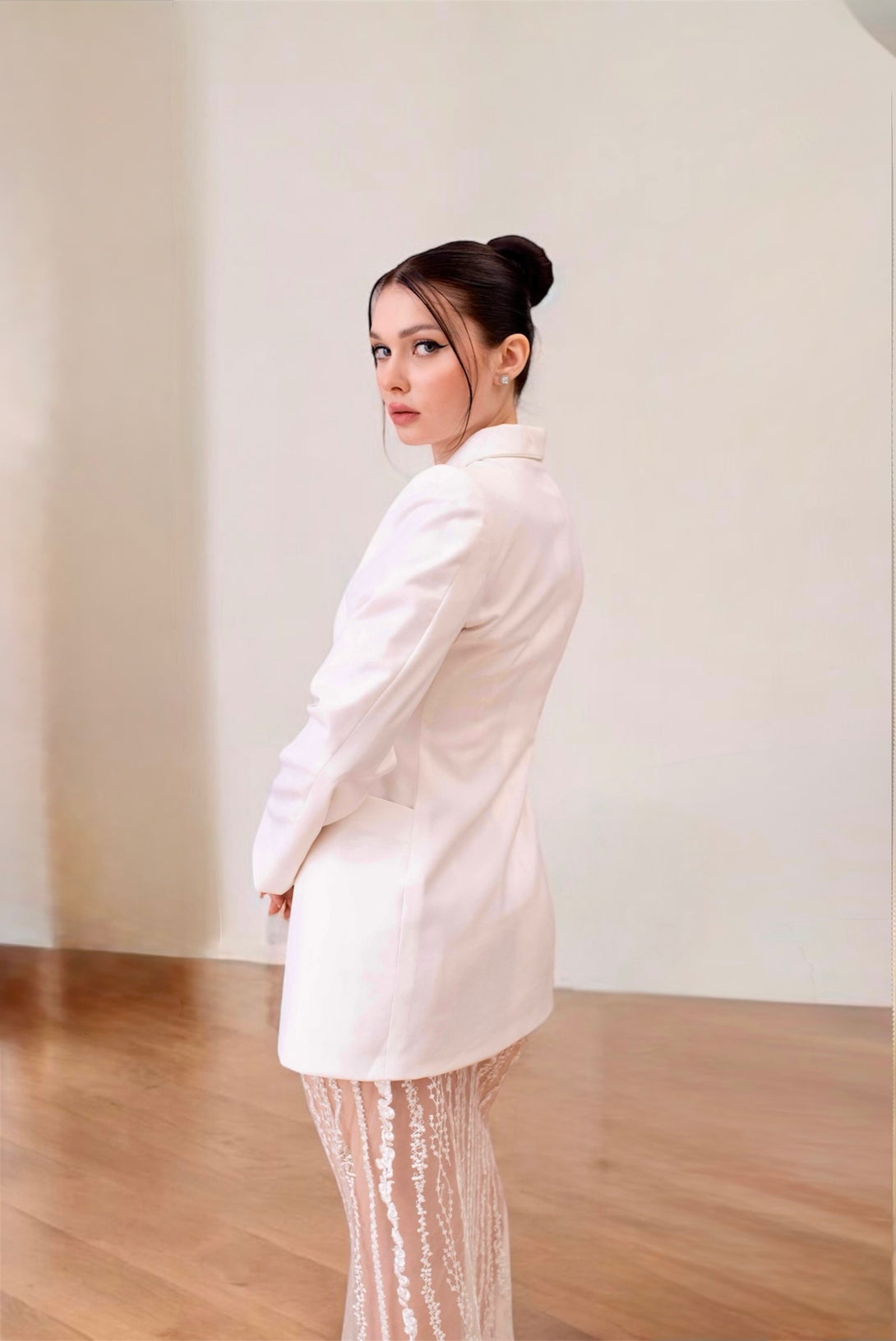 The blazer is a tailored, slightly longline white jacket with a deep V-neck and lapels.