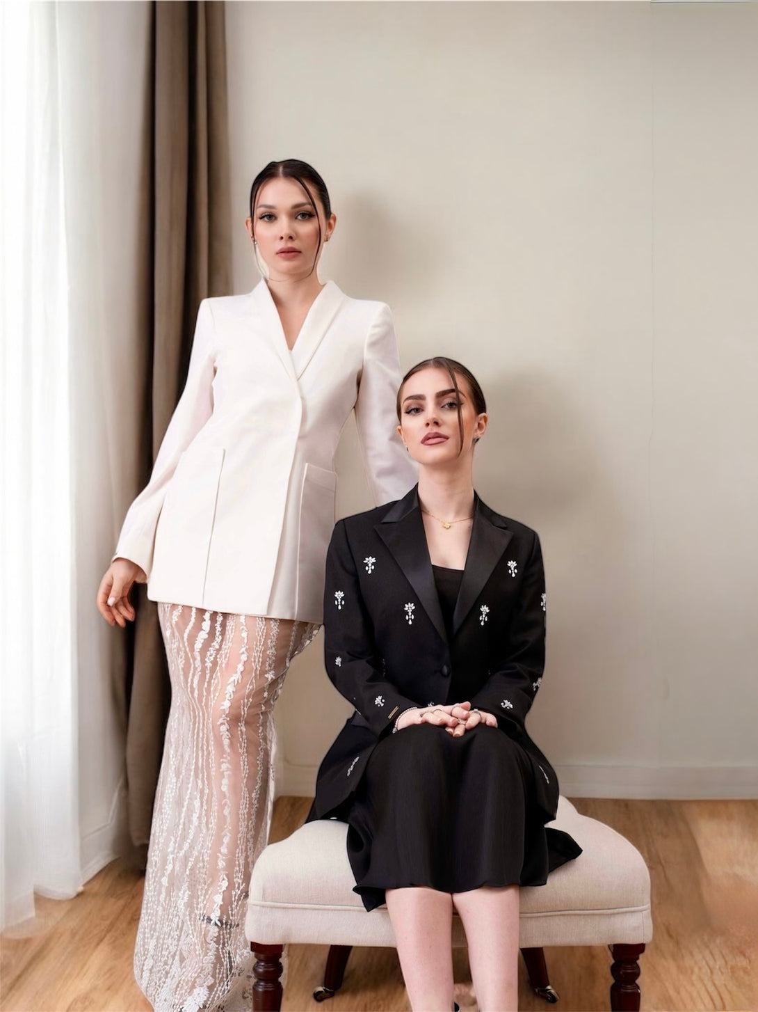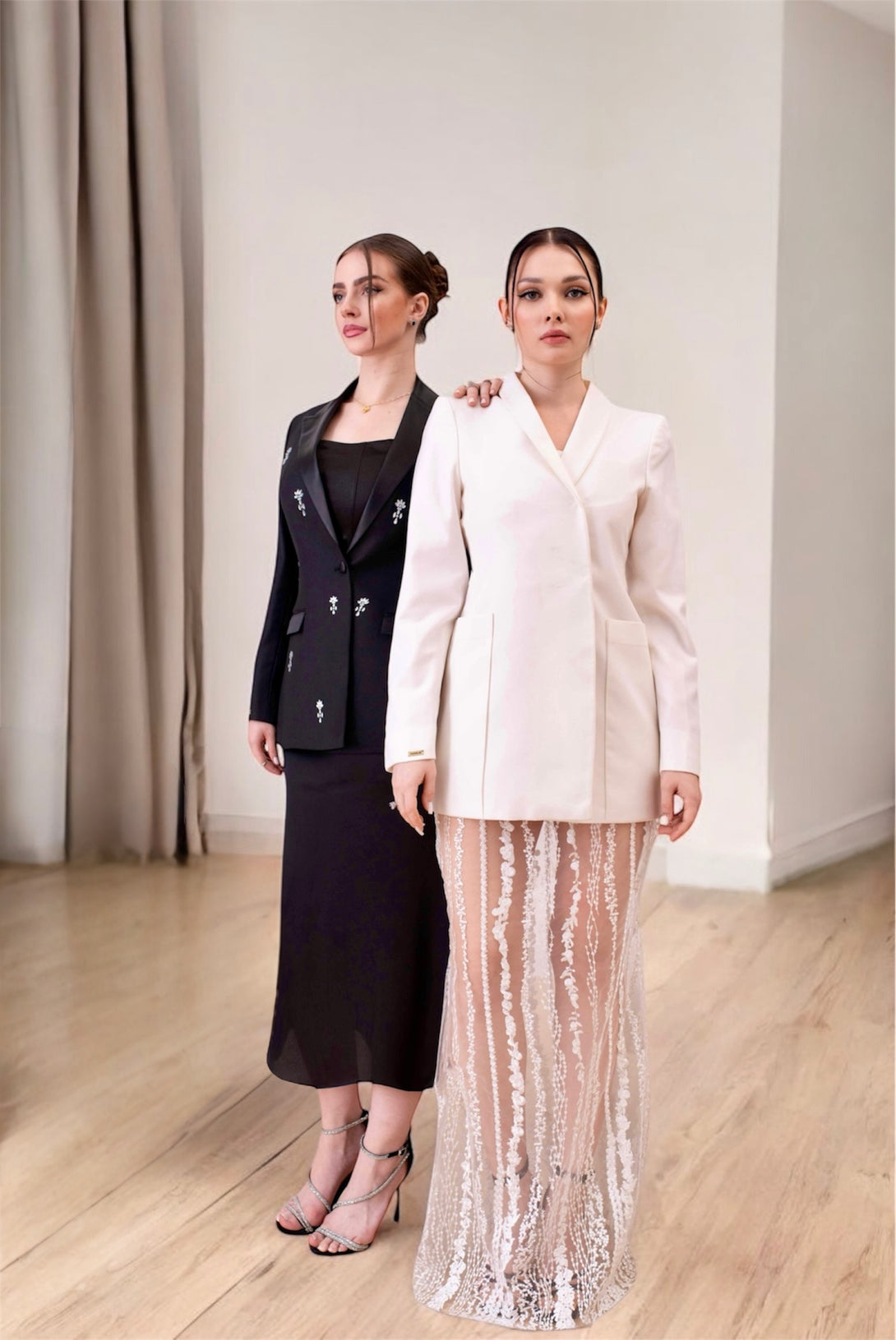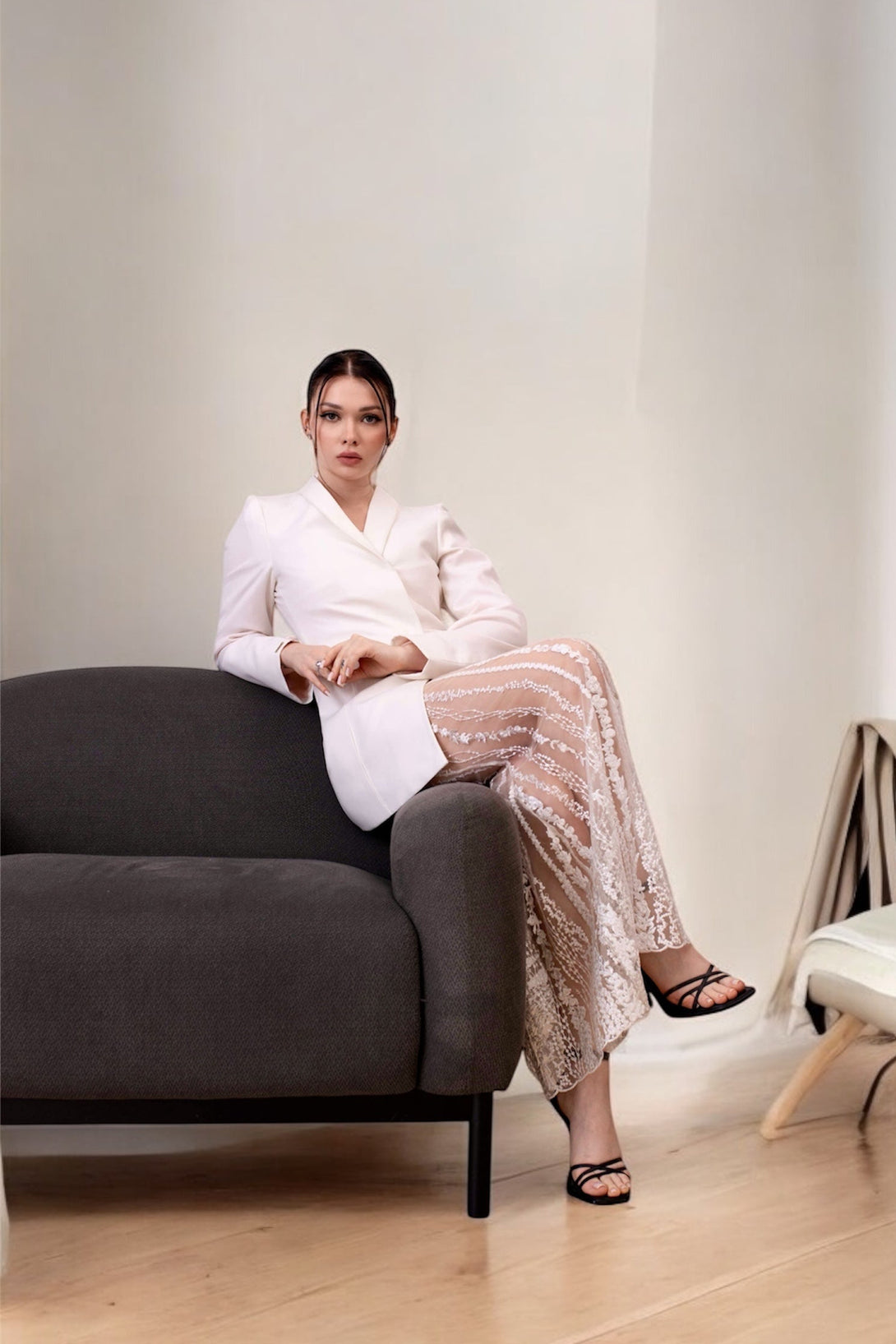 A striking, modern ensemble combining a long white blazer with a sheer lace skirt.