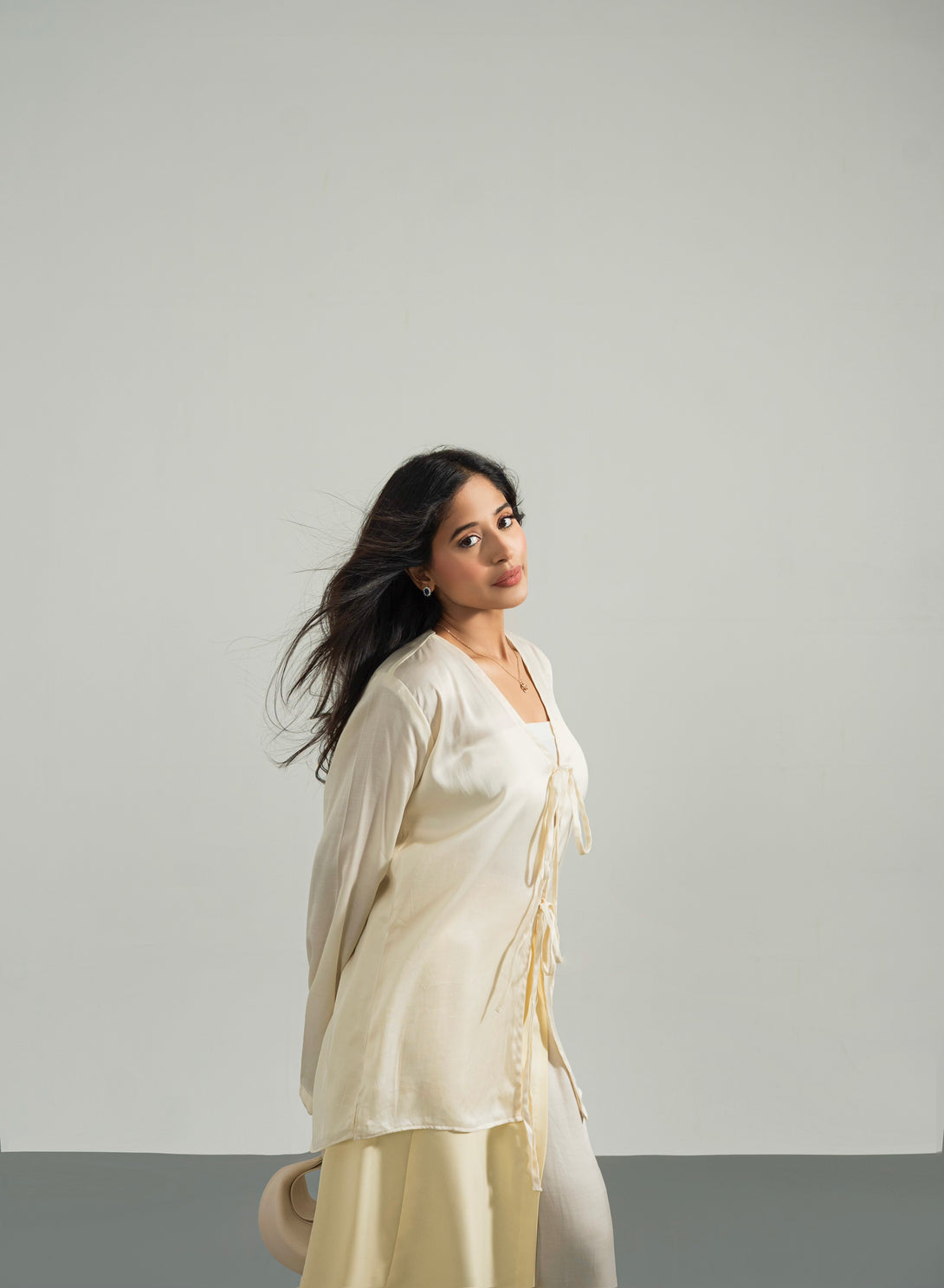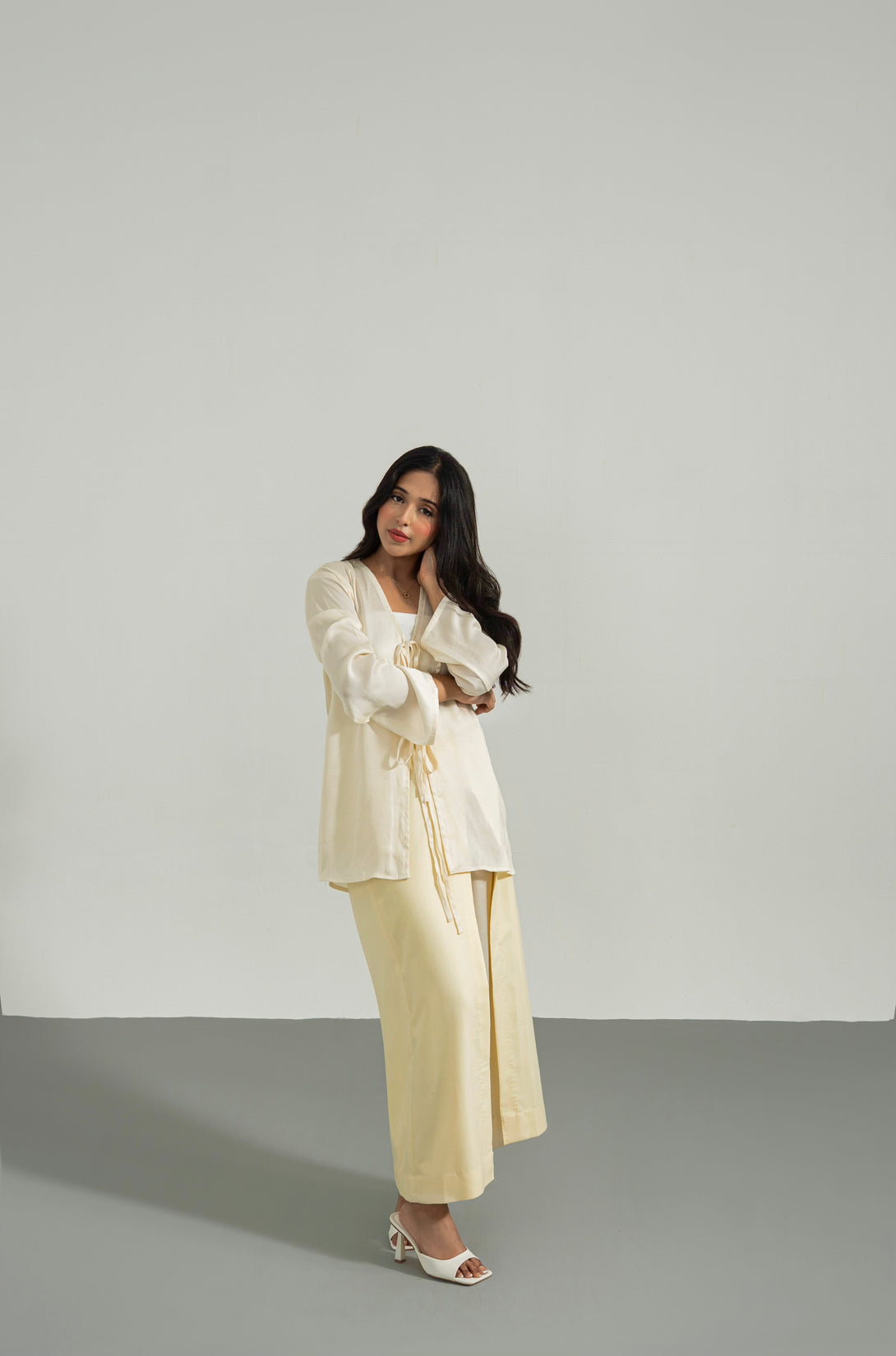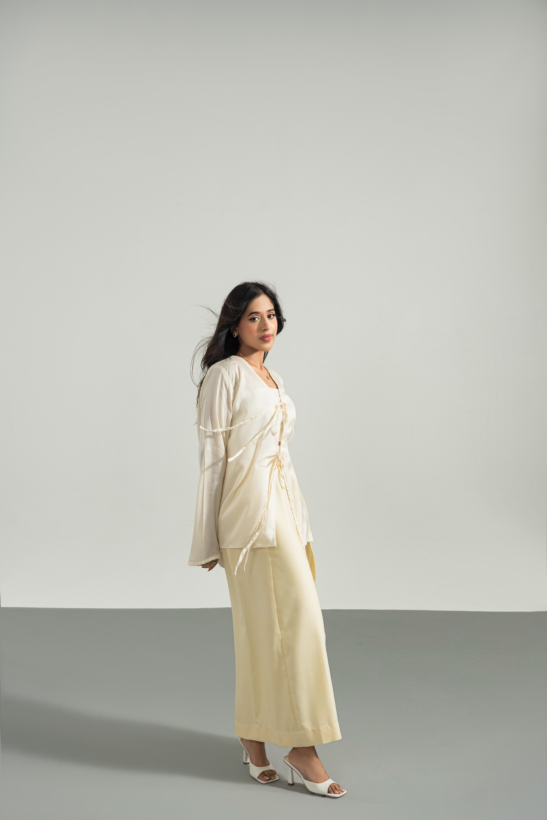 - Long, wide sleeves with a loose cuff, enhancing the relaxed, airy feel