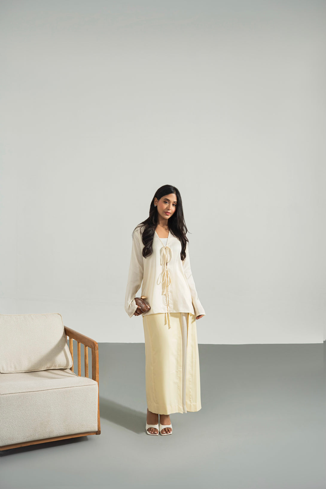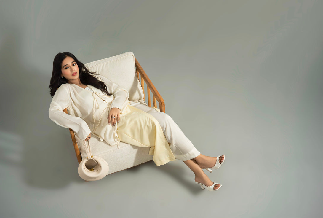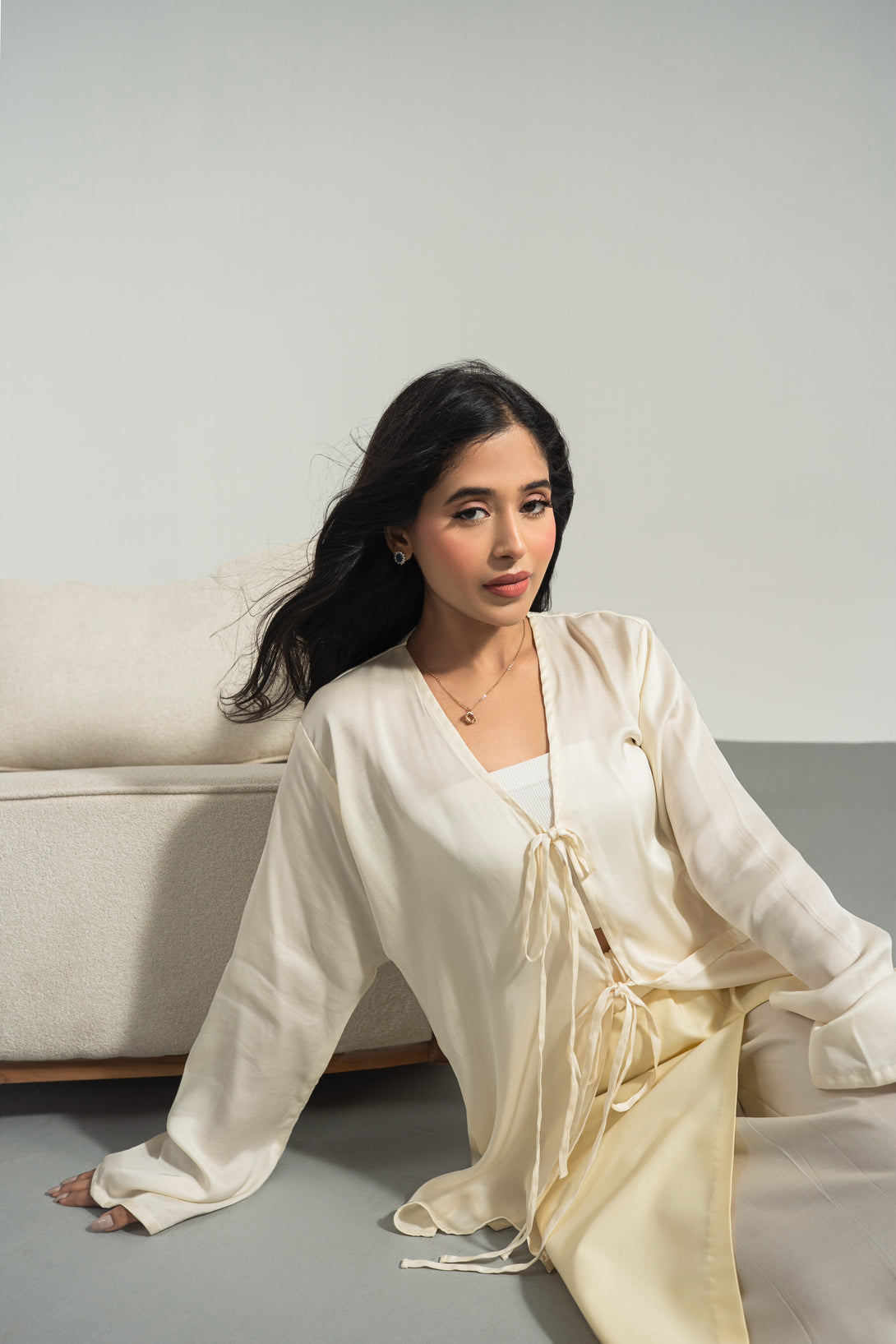 - Long, wide sleeves with a loose cuff, enhancing the relaxed, airy feel