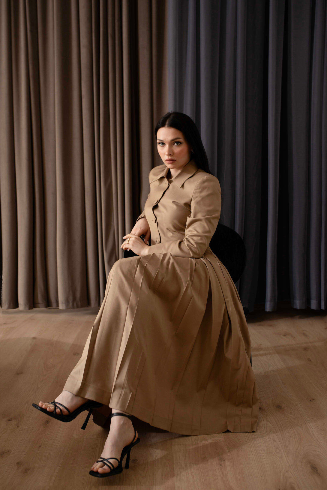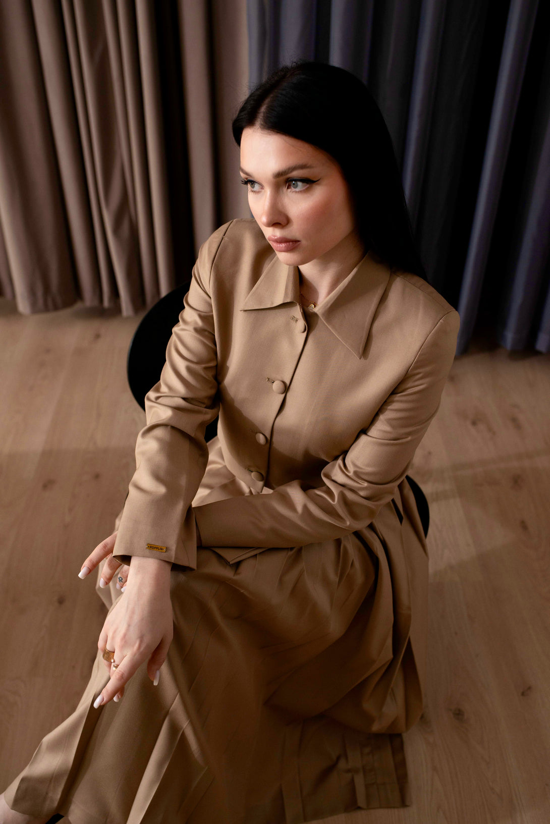 The fitted yoke of the skirt provides structure before the fabric flows into volume.