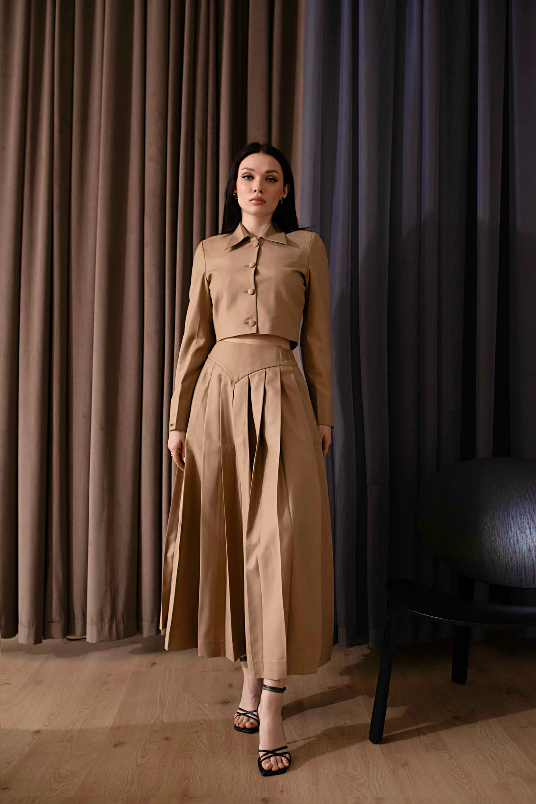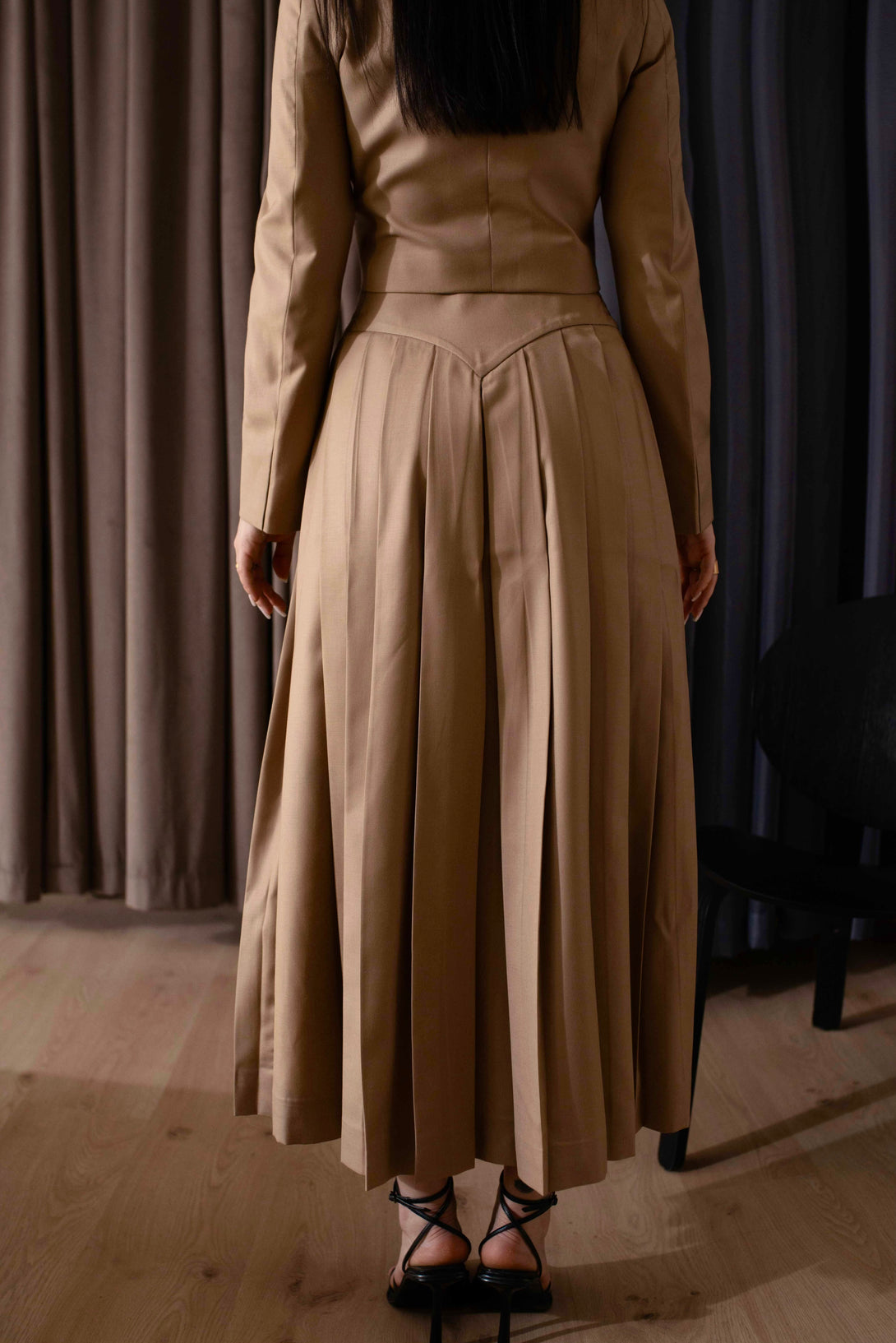 Dramatic high-waisted maxi-skirt with deep, sharp pleating.