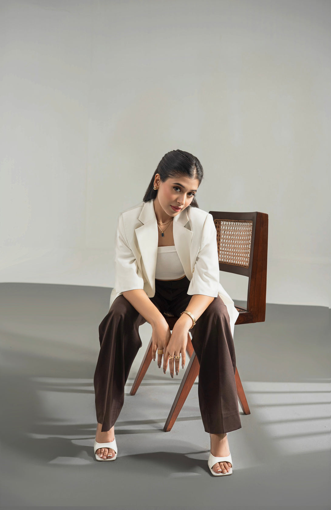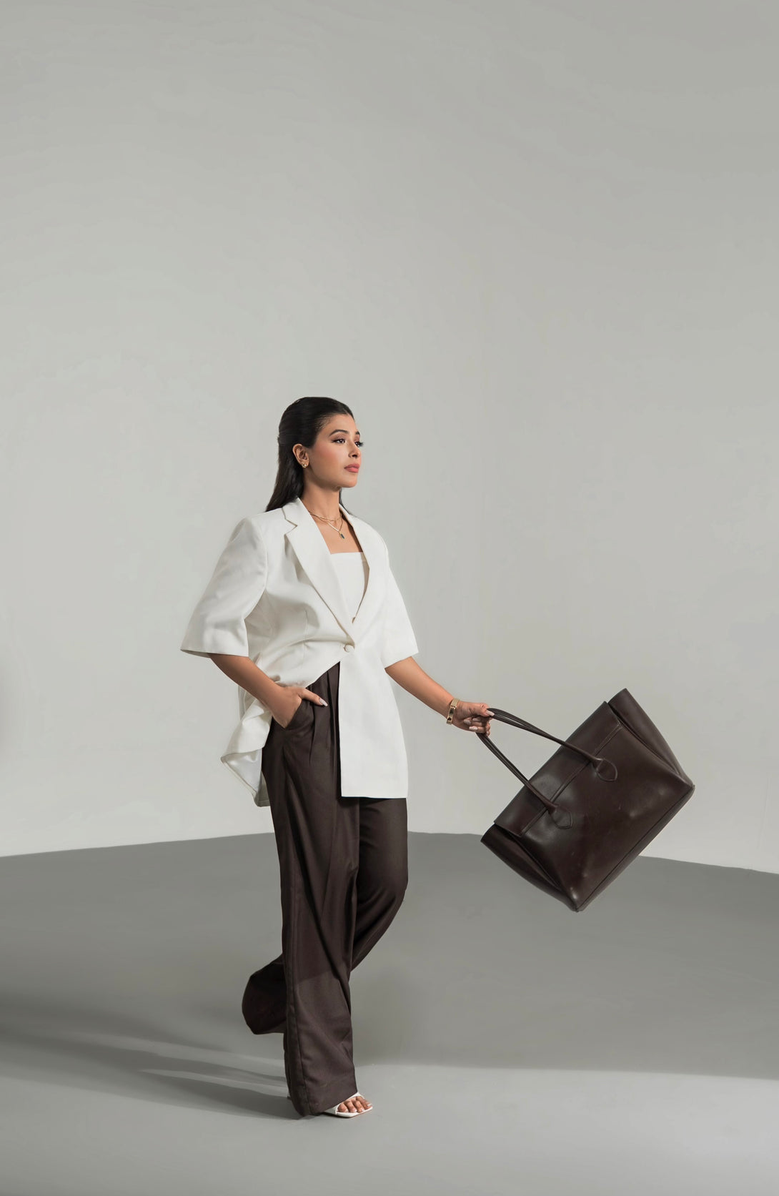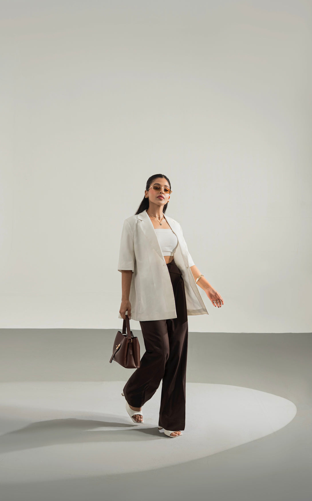- Classic notch lapels, three-quarter sleeves, a relaxed elegance