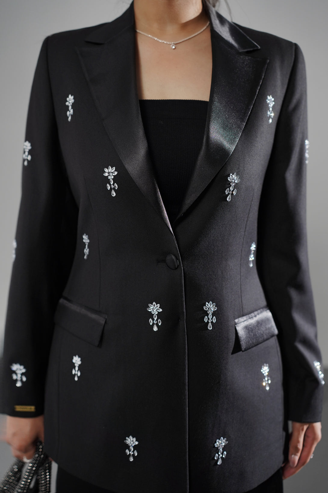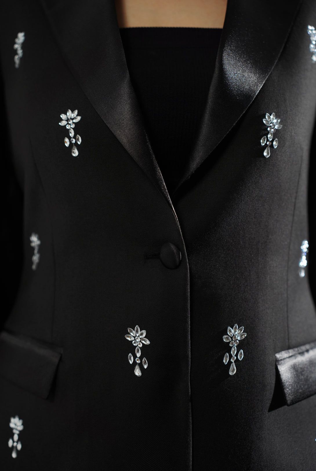 - Intricate, symmetrical pattern of small, sparkling clear rhinestone appliqués scattered across the front, shoulders, and sleeves